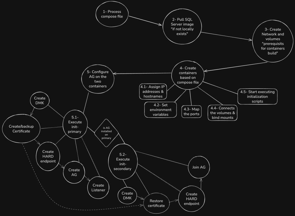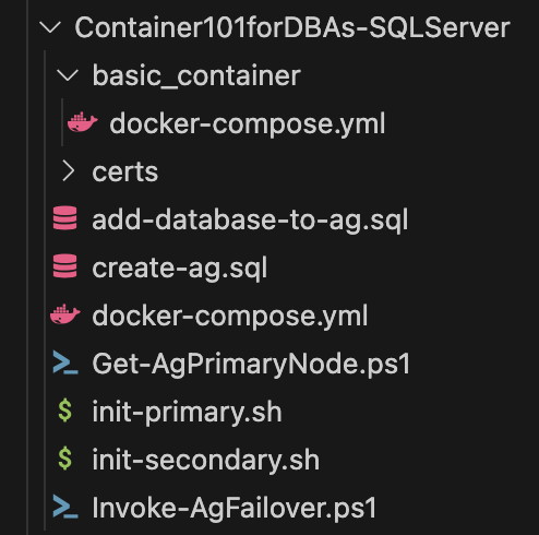 And below another diagram representing the relationship between the solution files, so after the docker-compose.yml file finishes the containers related work, it will start in parallel to execute both init-primary.sh and init-secondary.sh, while all SQL scripts required to be executed on secondary are imbedded inside init-secondary.sh, SQL scripts executed on primary are being stored in a dedicated SQL file “create-objects-ag.sql“.